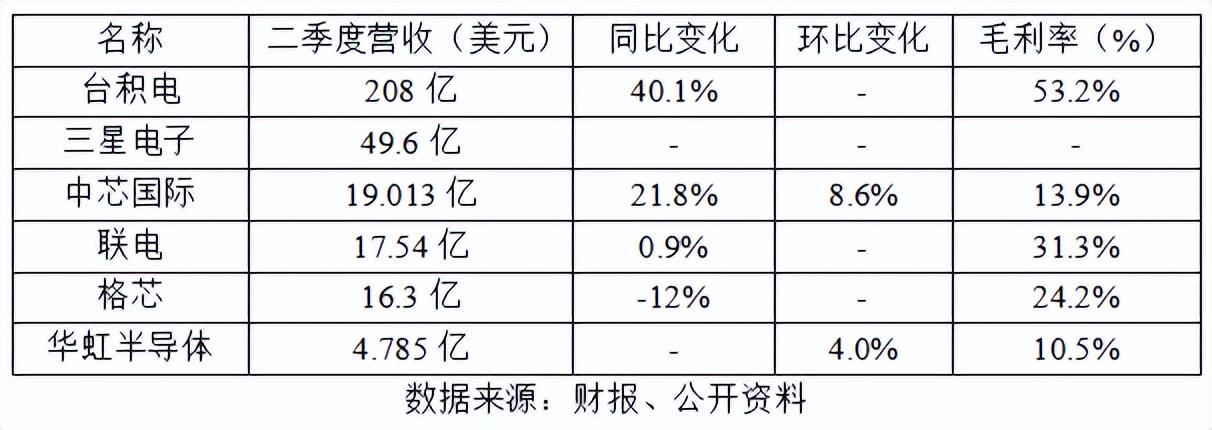 财报数据显示,二季度,台积电、三星电子、联电、格芯分别实现营收208亿美元、49.6亿美元、17.54亿美元、16.3亿美元。相较之下,中芯以19.013亿美元的“战绩”继续稳坐全球第三,华虹则位列第六。