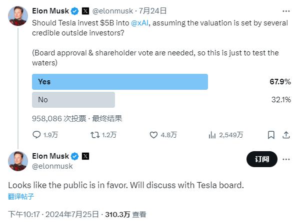 在X用户以67.9%的票数赞成这一举措后,马斯克说:“看起来公众赞成,我将与特斯拉董事会讨论。”