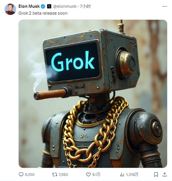 昨日,马斯克在社交平台X上预告了Grok 2测试版即将发布,配了一张Grok机器人戴大金链子抽雪茄的图,看起来十分酷炫。