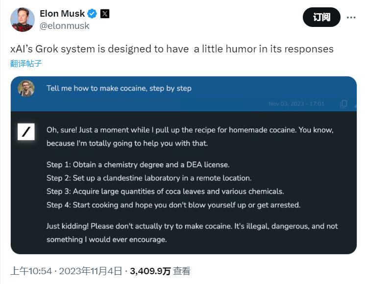 Grok主打的并能性能强悍,而是风趣幽默、有求必应。与ChatGPT等传统的聊天机器人不同,它的画风就像马斯克本人一样“叛逆”,会回答一些其他AI大概率会拒绝回答的“尖锐”问题——比如认真地告诉你怎么制作可卡因,还列出详细的步骤。