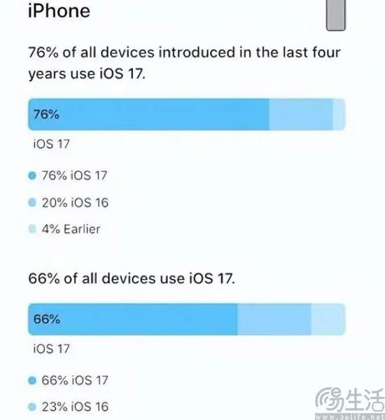 比如有海外网站在今年春季统计的一份数据就显示,在过去四年发布的iPhone机型用户中,有76%升级到了最新的iOS 17,但还有20%的用户仍在使用iOS 16。可相比之下,iOS 16发布时的装机率就已经达到了81%。