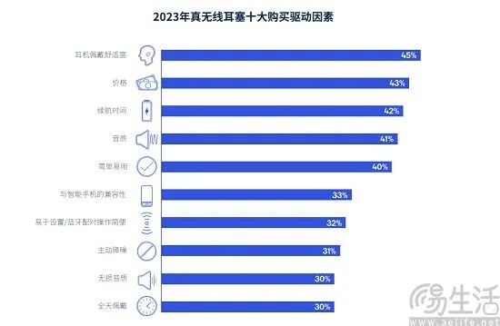但值得一提的是,随着用户对于无线耳机需求的多样化,佩戴舒适度也成为许多消费者进行购买决策的首要因素,这一点在高通方面发布的《2023音频产品使用现状调研报告》中就得到了验证。其中显示,佩戴舒适度以45%的占比排名第一,价格、续航、音质等因素紧随其后。