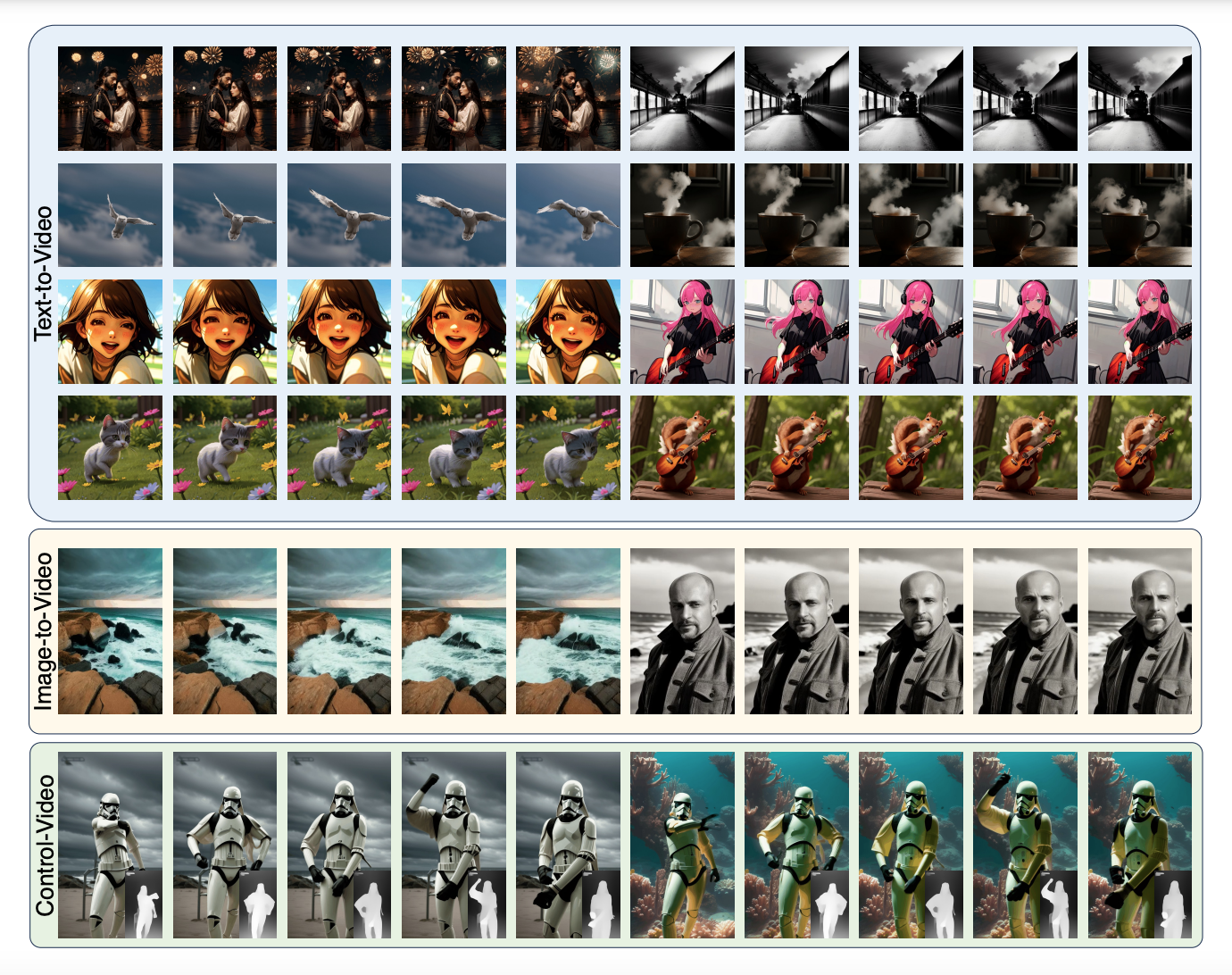 AnimateLCM的生成结果,包括文生视频、图生视频和可控视频生成。图源:AnimateLCM: Accelerating the Animation of Personalized Diffusion Models and Adapters with Decoupled Consistency Learning