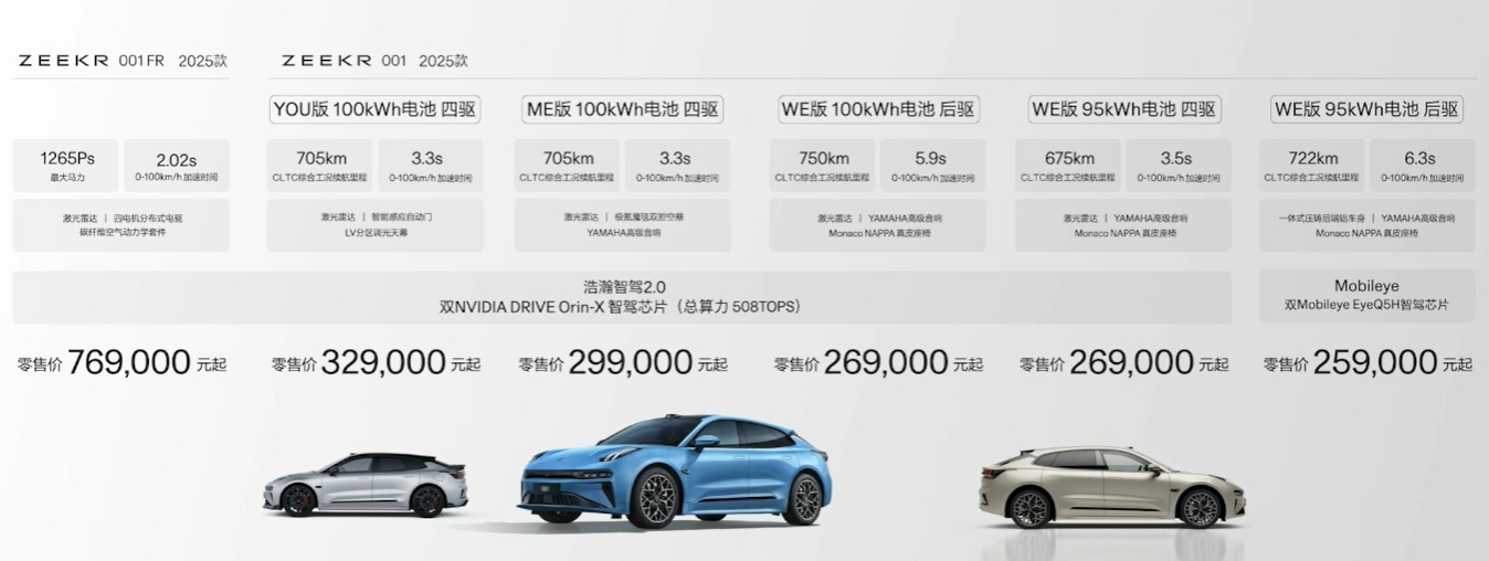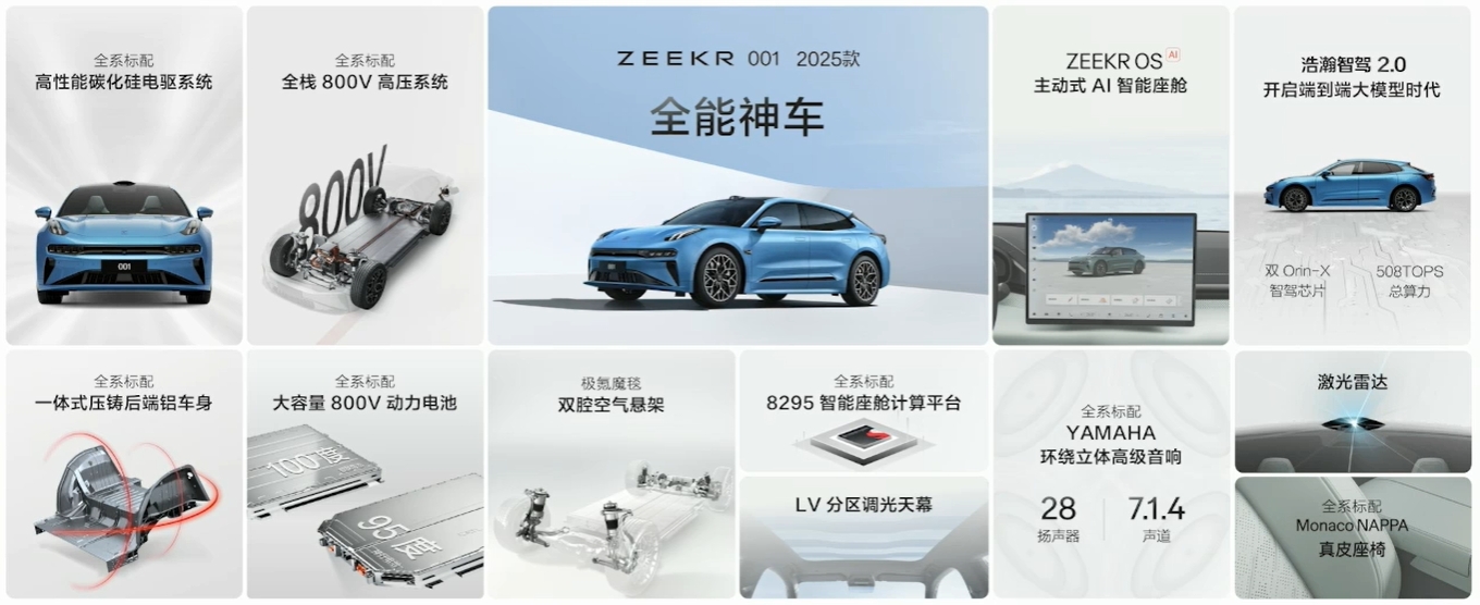 至于2025款极氪001,本次升级重点其实只有一个:25款极氪001将用上极氪007同款的“浩瀚智驾2.0”,同时采用“浩瀚智驾2.0”方案的车型也将标配激光雷达,而价格则保持不变。