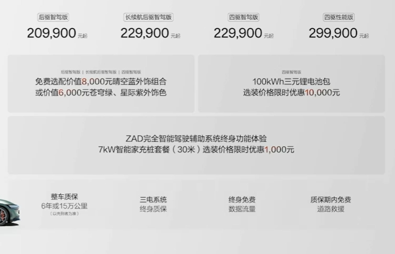 简单说一下价格,2025款的极氪007不论配置升级的情况下相比24款车型普遍降价在2万以上,后驱智驾版起售价来到了20.9万元(原来是22.9万元),价格最高的依然是四驱性能版,还是29.9万元。