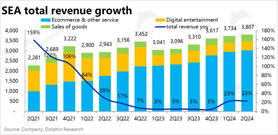 主要由于电商板块比预期更强的增长,本季Sea整体实现收入38.1亿,同比增长23%,和上季度持平并未放缓,比市场预期的增速高3pct。