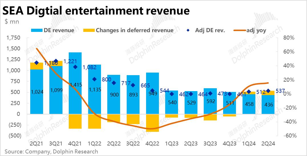 初看之下Garena的GAAP口径下收入本季同比下滑了18%到4.36亿,明显低于市场预期的5.1亿。但这主要是递延收入变动的影响,相比过去几年GAAP口径收入持续从递延收入池中“抽水”,本季新增递延收入达到1亿。