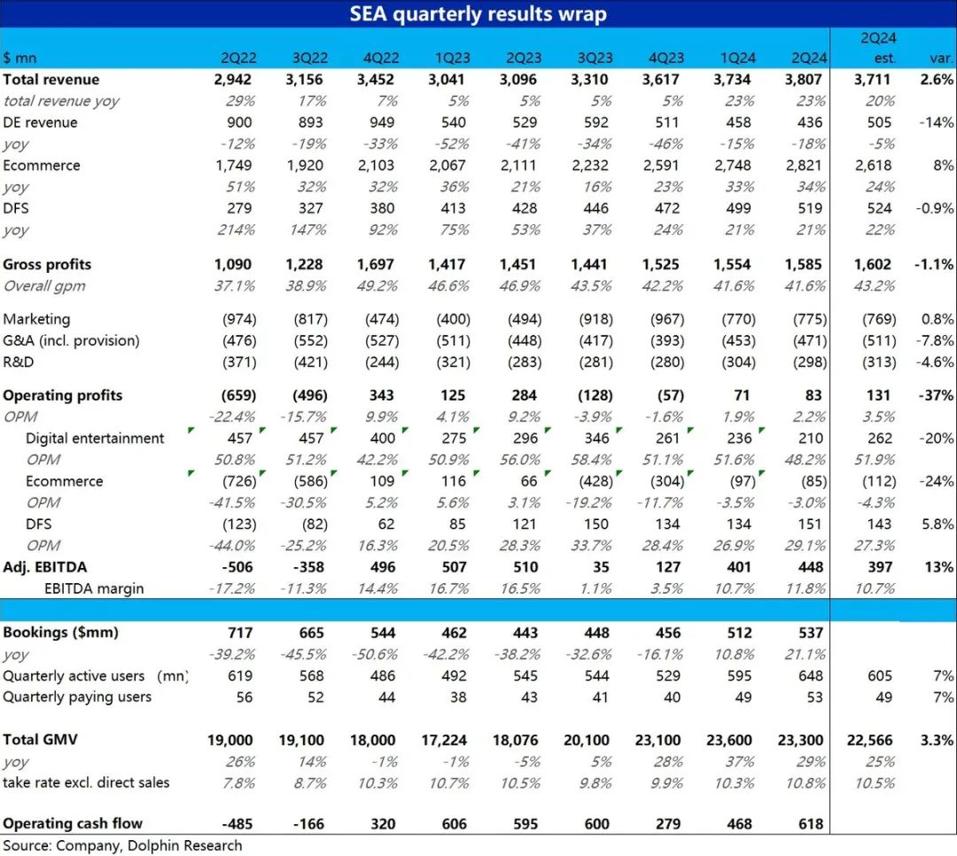 北京时间8月13日晚美股盘前,东南亚小腾讯Sea公布了2024年二季度财报,相比保守的预期,实际业绩要更好,核心要点如下: