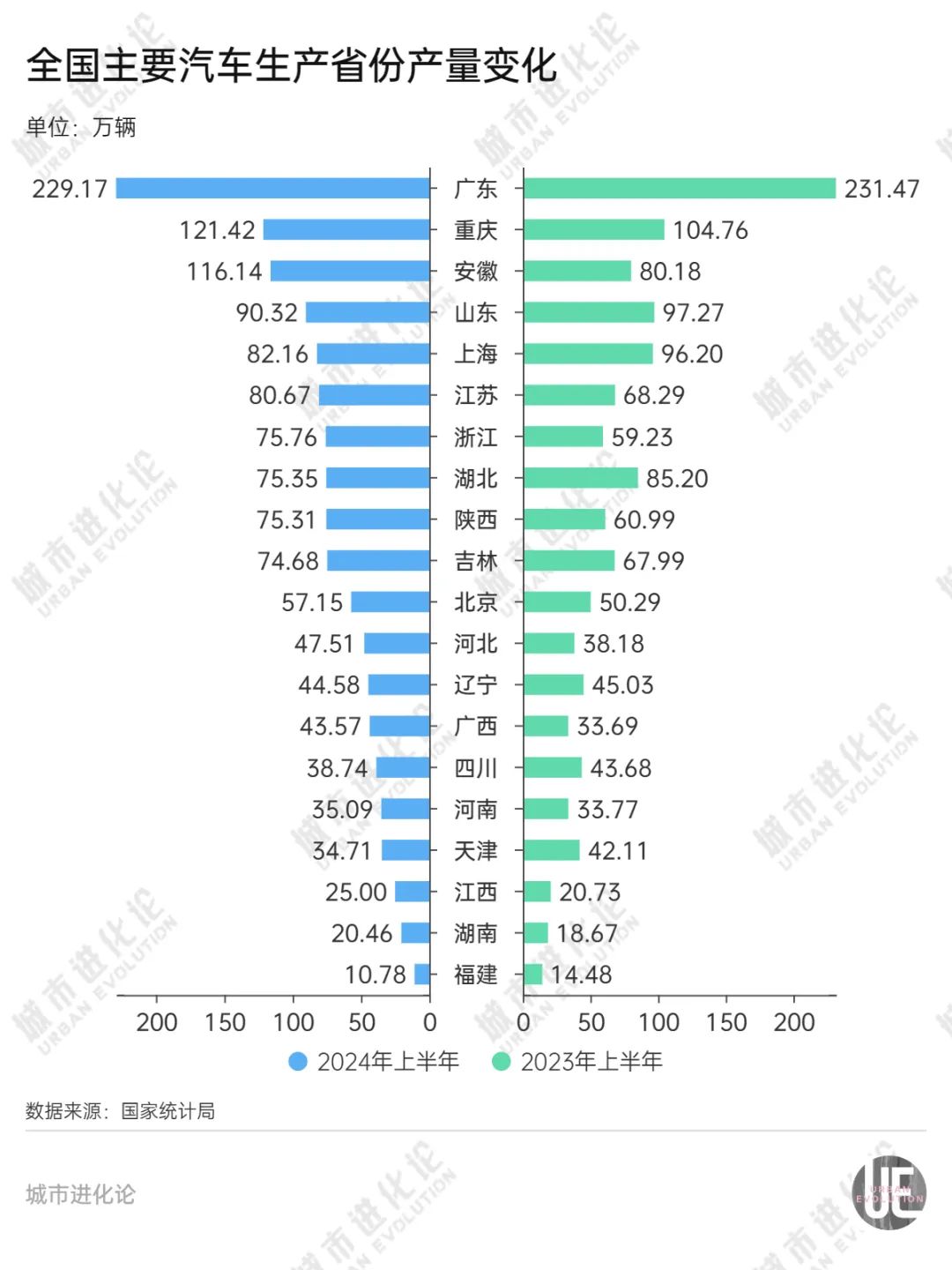 今年上半年,广东(229.17万辆)、重庆(121.42万辆)、安徽(116.14万辆)、山东(90.32万辆)、上海(82.16万辆)、江苏(80.67万辆)、浙江(75.76万辆)、湖北(75.35万辆)、陕西(75.31万辆)、吉林(74.68万辆)汽车产量排名全国前十,前十阵营的门槛已从去年50余万辆上升至70余万辆。