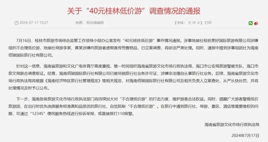最离谱的还是近期引发热议的“40元4天3晚桂林低价游”事件。后续涉事旅行社因涉嫌组织不合理低价游、虚假宣传兜售物品,已被立案调查。
