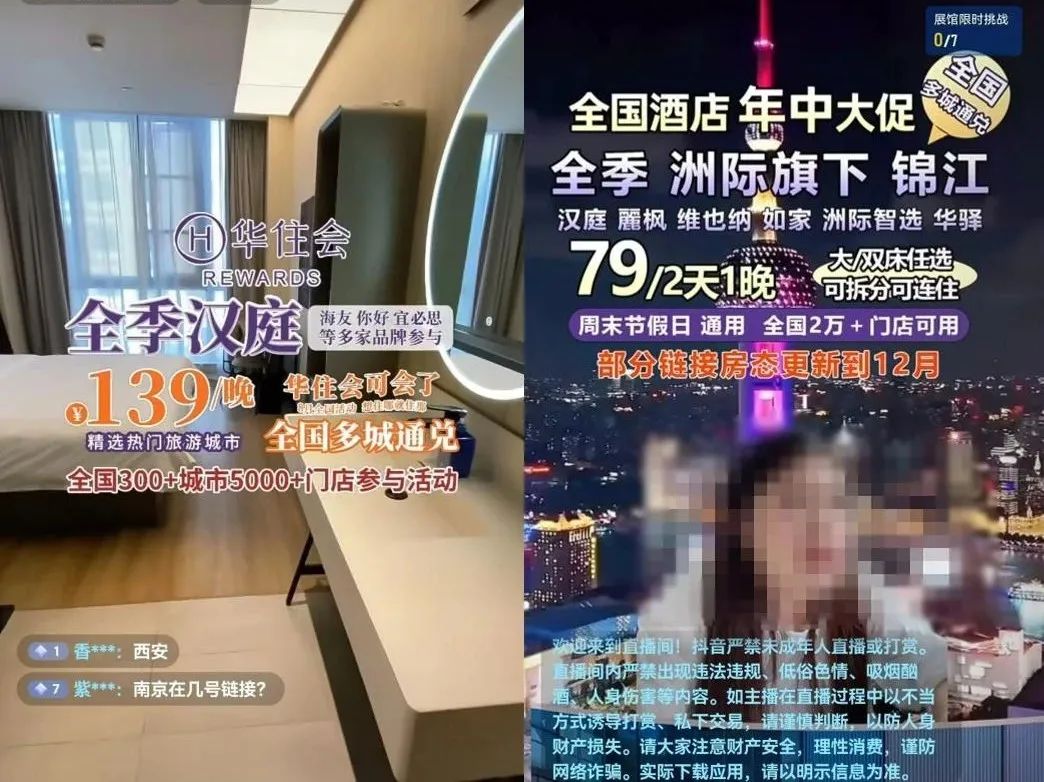 截至目前,抖音上仍存在不少号称“超低价睡遍全国”的直播间,只需100+就能住上全季、汉庭、桔子等酒店,更有甚至宣称79元就能让你住上洲际旗下酒店。