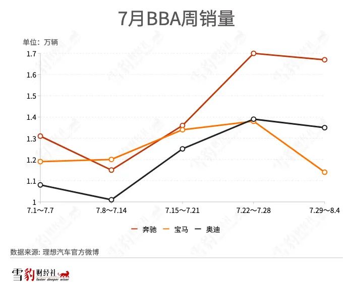 7月,宝马每周的销量呈递增趋势。奔驰和奥迪则分别在第三周和第四周超越了宝马。