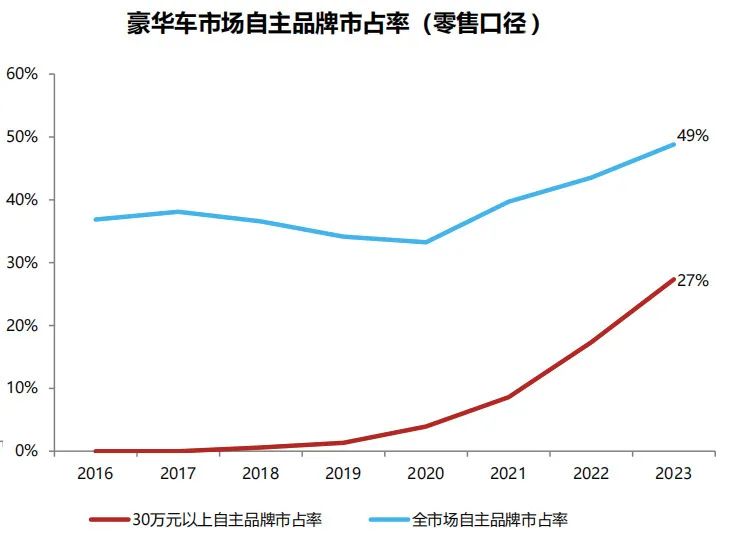 张峰所感受到的最强力冲击,来自于自主品牌。据东吴证券统计,自主品牌凭借在智能化和电动化领域的优势,自2021年起在30万元以上市场的市占率持续提升。2023年,自主品牌在豪华车市场市占率达到27%,BBA的市占率则下滑至45%。