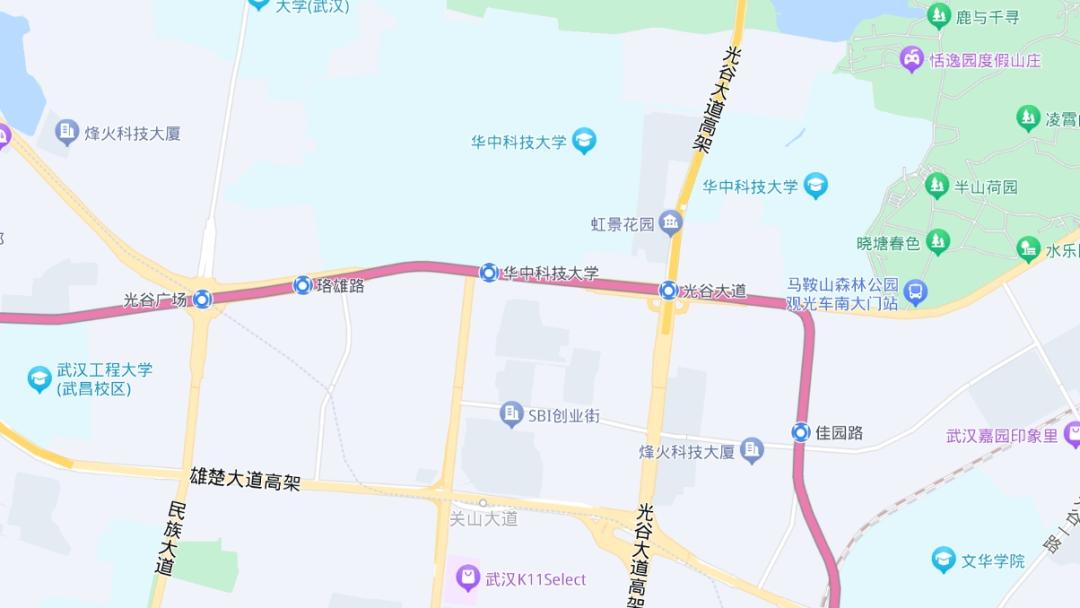 从佳园路站上车,到光谷大道站、华中科技大学站、珞雄路站、光谷广场站,站站都是华中科技大学。