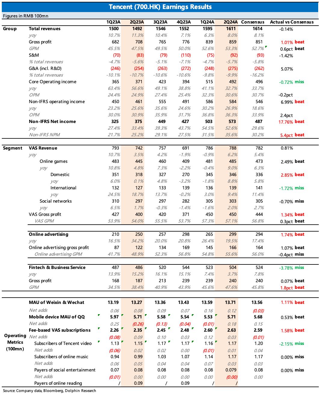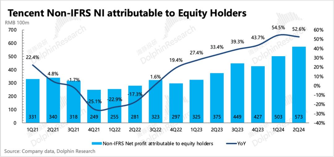 从回购量来看,腾讯继续加大回购,环比增长250%:二季度回购了1.55亿股,耗用523亿港元,购回的股份已被注销,总股份环比1Q24减少0.4%。