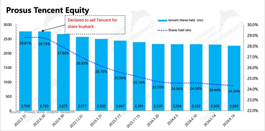 相比我们在5月的统计,大股东Prosus 在5月14日至今3个月内抛售了3970万股,相比上个周期平均月抛售节奏(1250万股/月)略有加速。但因为腾讯回购注销力度更大(4000万/月),截至二季度末,大股东持股比例变化不大,仍有24.34%,其净资产/股价=62.53%,也就是折现率为37.46%,二季度以来有一定提升。
