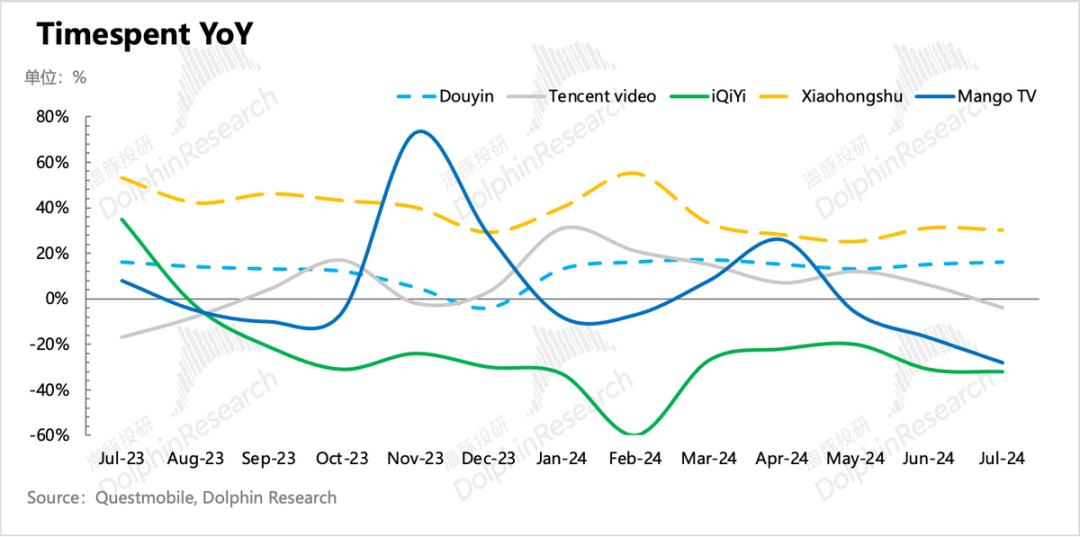 不过腾讯视频虽然二季度多部剧爆火,《与凤行》、《庆余年2》、《玫瑰的故事》,但环比会员数仅新增了100万。从Questmobile数据来看,更多的用户还是选择把时间花给抖音、小红书等平台,同为长视频的爱奇艺、芒果都表现更为稀烂。