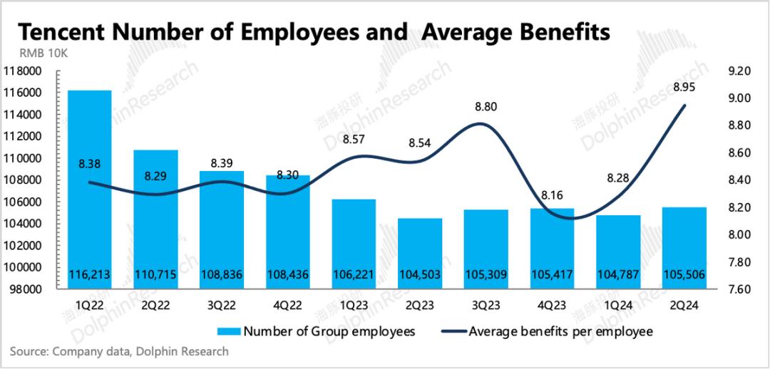 虽然二季度提效趋势再次被打破,但海豚君仍然认为中长期下,腾讯还有经营提效潜力。一方面当下员工规模的绝对体量庞大,相对当前成熟的商业模式仍显臃肿;其次AI等新技术短期需要投入,但中长期对企业的内部效率优化会有更多的帮助。Q2员工新增,并不代表腾讯迈入了新投入周期,考虑到社会影响和短期经营变化,滚动式小步优化仍然是股王战略方向。