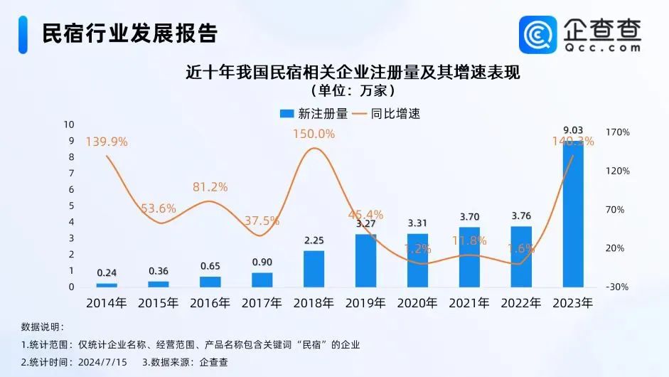 企查查显示,仅 2023年,全国新注册民宿企业数量就达到了9.03万家,较2022年同期疯狂增长了149%。