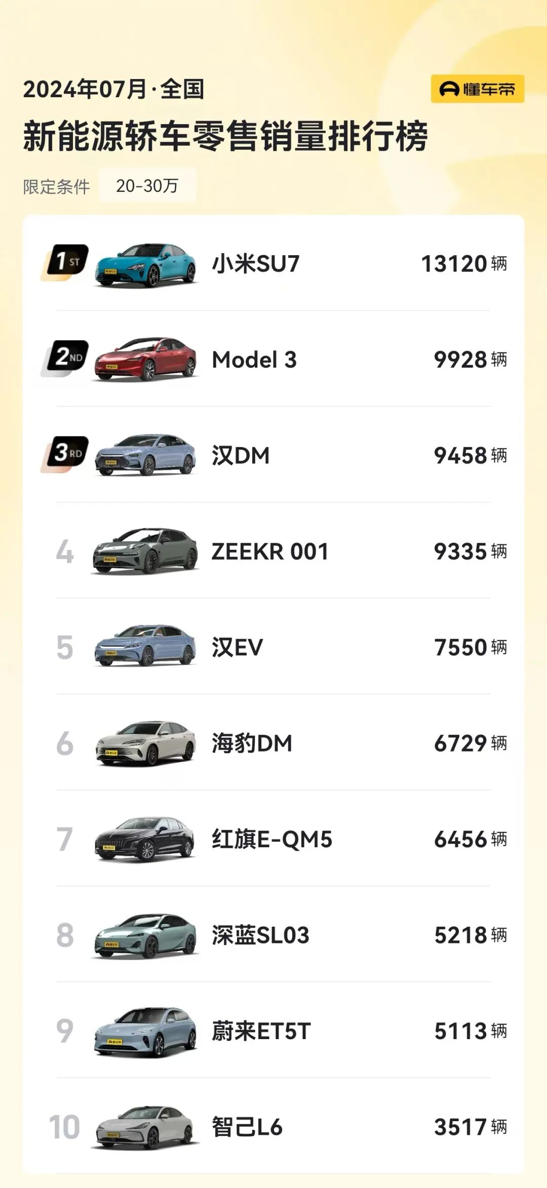 可刚刚过去的7月,战局又发生了变化。疯狂输出的小米SU7又一次以13,120辆的表现,战胜了每季度初略显疲软Model 3的9,928辆。
