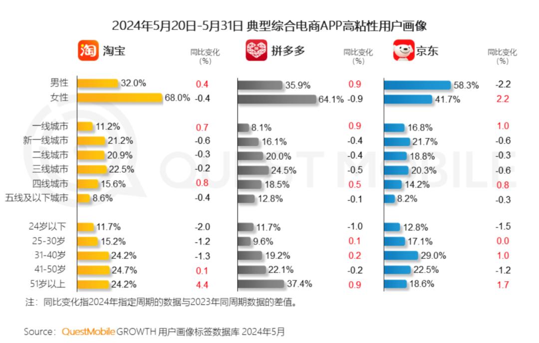 对比而言,QuestMobile披露的数据显示,2024年5月下旬,拼多多二线及以下城市用户占比高达75.8%,并且41岁以上用户占比高达59.5%,大部分用户位于低线城市,并且年龄偏大。这些用户天然追求极致低价商品。拼多多财报显示,其售卖的商品平均客单价仅为40元左右。