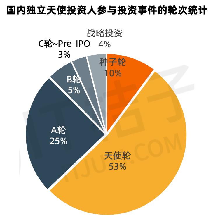 根据 IT桔子,独立天使投资人参与的投资事件合计有1 235起。其中种子和天使投资事件占比63%,A轮占比为25%,独立天使投资人参 与B轮后的事情占比仅1 2%。