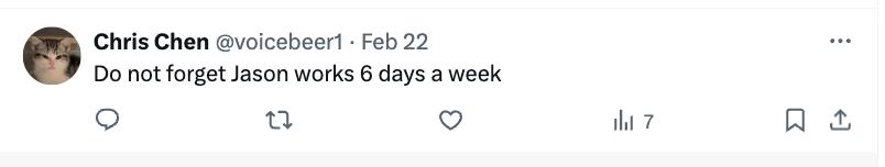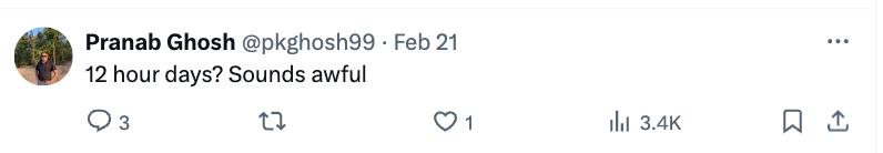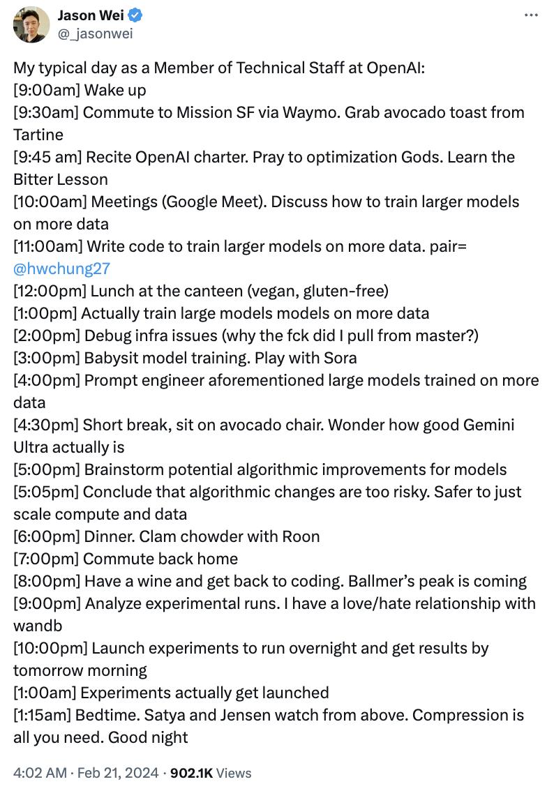这很难不让人联想到 Jason Wei 爆出的在 OpenAI 「996」的作息表。在 OpenAI 的一天从 9:45 开始,一口气都不停歇地工作 12 个小时,直到凌晨一点。