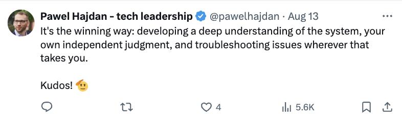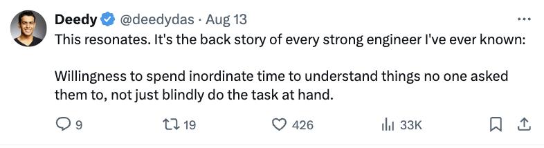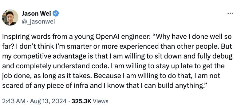 思维链作者,在 OpenAI 任职的 Jason Wei 几乎在同时引用了一位年轻的 OpenAI 工程师的言论:「为什么目前我做得不错?我并不认为这是因为我比其他人更聪明或更有经验,而是因为我的竞争优势在于我愿意坐下来彻底地调试并完全理解代码。我愿意熬夜完成工作,不管这需要多长时间。这都是我自愿的,我不怕任何从零打造的项目,因为我知道面对任何事,我都能行。」