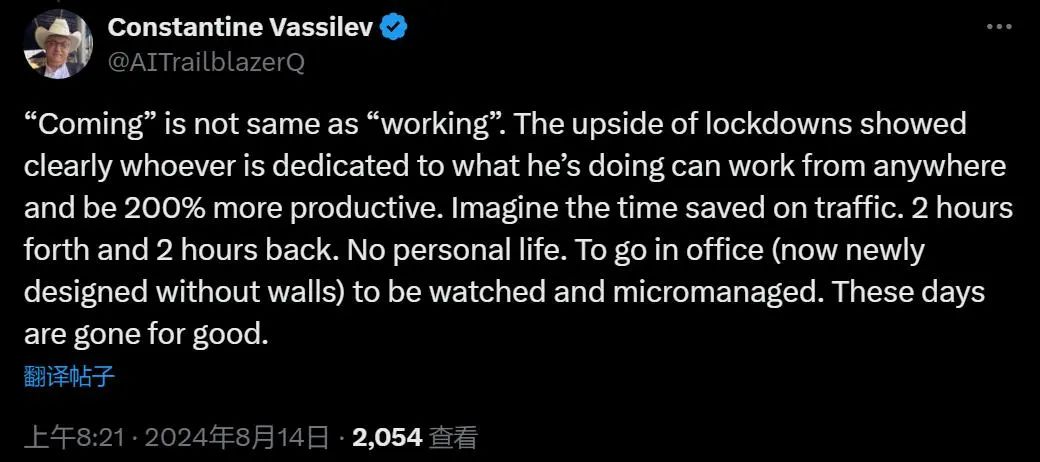 也有人表示反对:人来了不等同于在工作。最近几年大家的经历证明,任何专注的人都可以在任何地方工作,并且效率提高 200%。