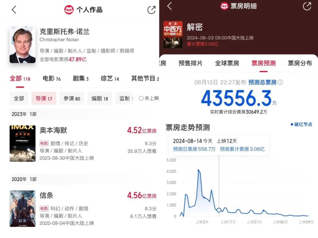 至于小众的传记电影,诺兰导演的《奥本海默》在国内也只卖4亿多,《解密》卖过4亿也不成问题,已经算观众给陈思诚面子了。