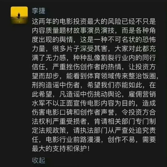 近日阿里影业总裁李捷的一条朋友圈,引起了圈内外的热议。他认为舆情已经成为电影投资需要面临的一大风险。从各个角度出现的舆情防不胜防,像是不可名状的“恐怖力量”。他希望体育领域整治饭圈、刑拘造谣者的行动,也能够出现在电影圈。