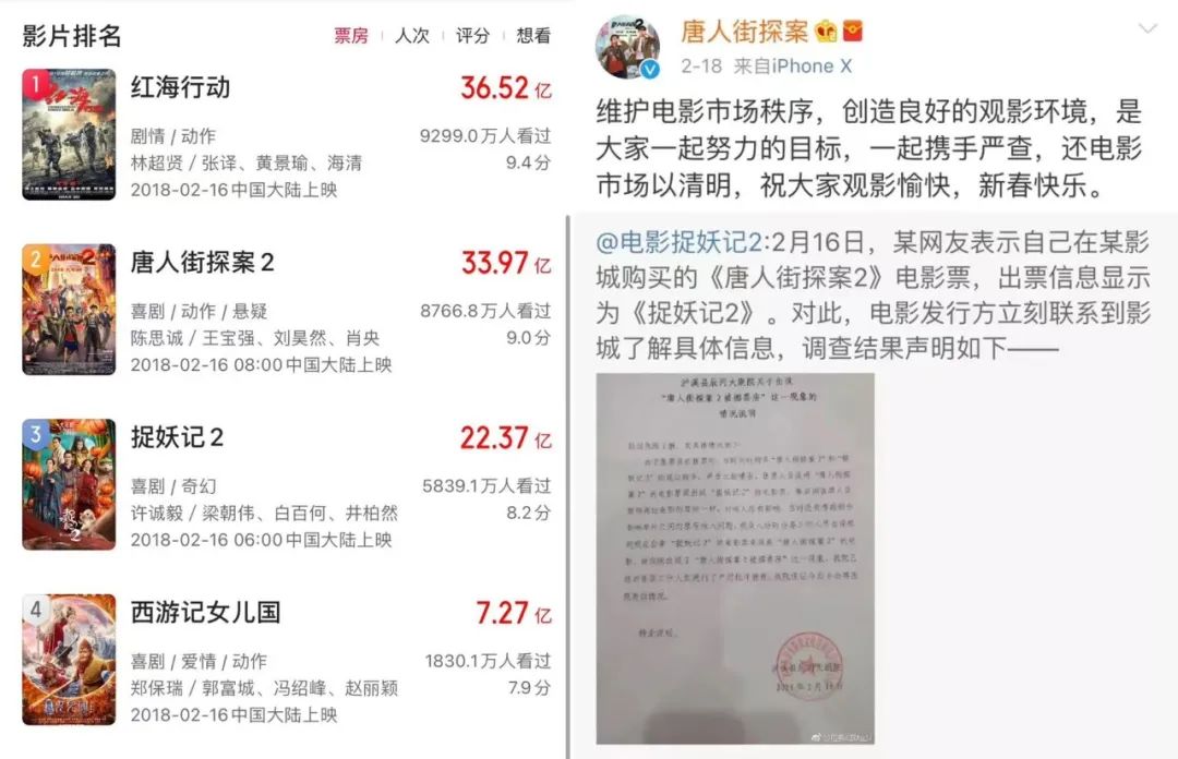 电影的负面舆情早已有之,上一次“黑水军”引发片方直接对峙还是在2018年。那年春节档,《捉妖记2》《唐人街探案2》《红海行动》和《西游记女儿国》四大巨片围绕偷票房、刷负分打得不可开交。