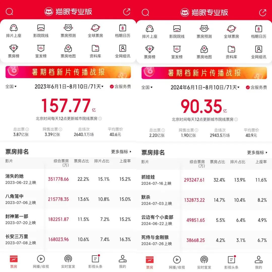 现在回过头来看,2023年的暑期档能够再造票房神话,或许主要归功于报复性消费潮。今年的经济状况和人们精神状态,相比去年也发生了不少变化。硬糖君身边一个做玄学咨询的朋友表示,去年客户大多咨询的是情感问题,今年几乎都是咨询工作了。