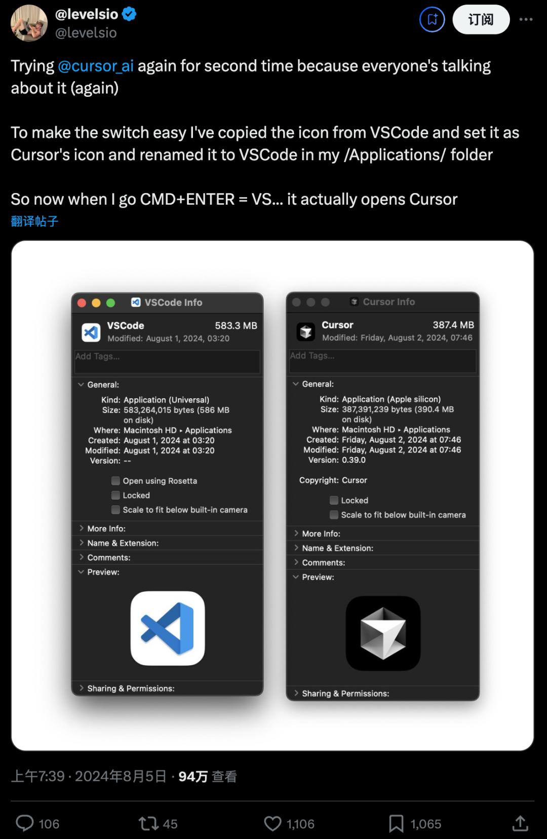 把Cursor应用的名字和图标都改成VS Code,下次写代码凭肌肉记忆启动VS Code,实际上都会打开Cursor了。