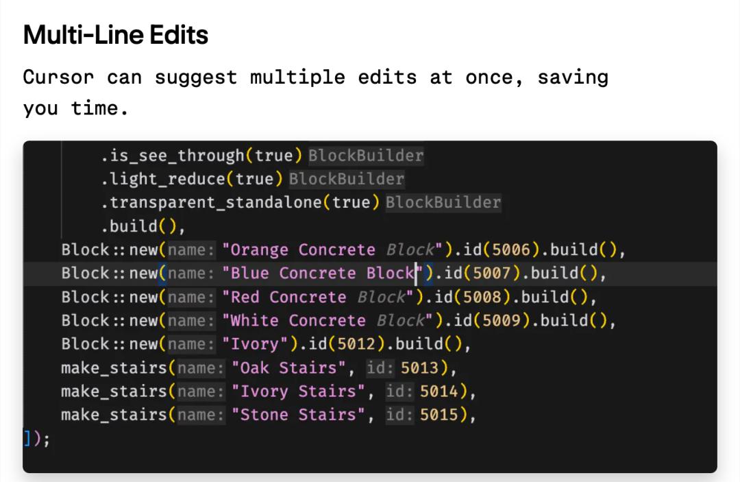 又比如多行编辑功能,AI一次性建议对多行代码同时修改,节省更多时间,经常用于格式调整。