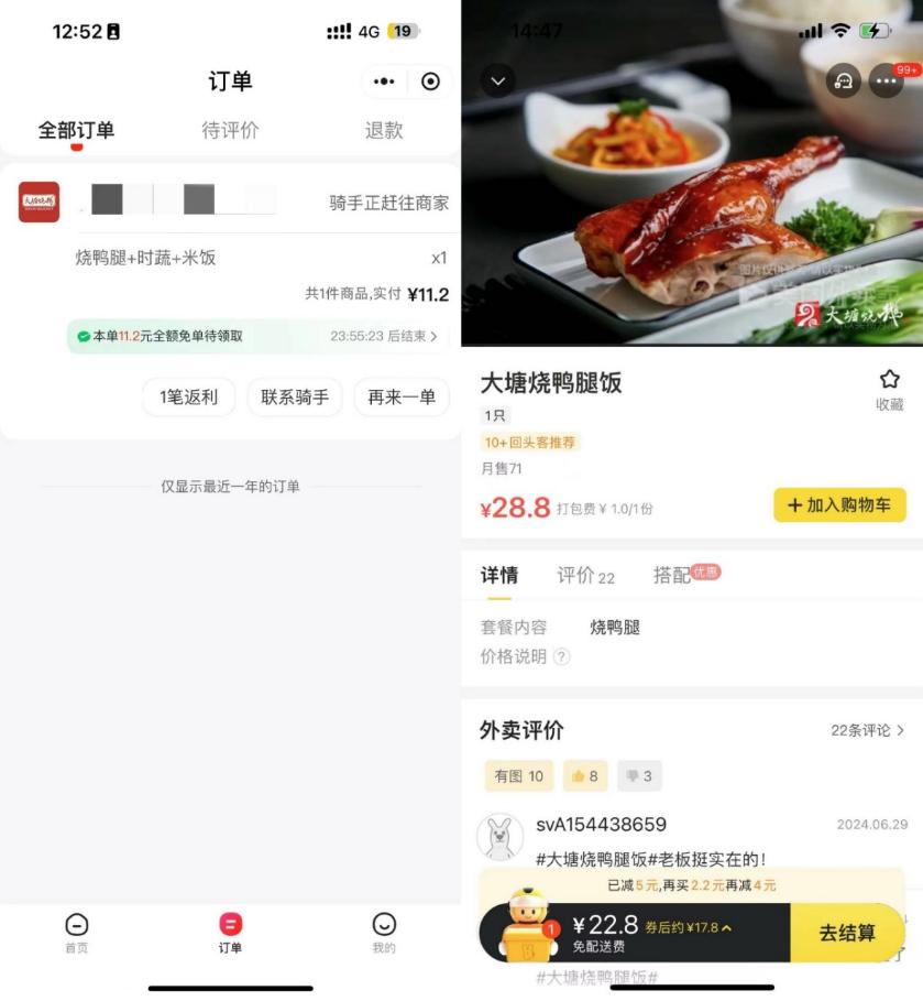 “拼好饭”的操作比直接点餐稍微复杂一点,但好处是“便宜”。以广州CBD珠江新城附近的餐厅为例,在同一家餐厅单独点一份烧鸭腿饭,价格是28.8元;如果选择拼单,则只需要11.2元。