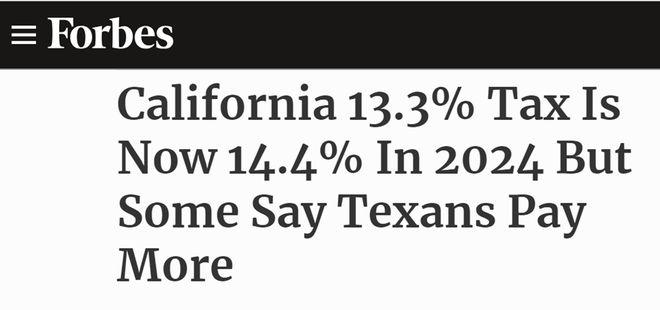 税收同样感人。加州号称“万税之都”,有着全美最高的州个人所得税和资本利得税税率,最高税率14.4%,从税收角度来看,营商环境在美国50个州里排名倒数第二。
