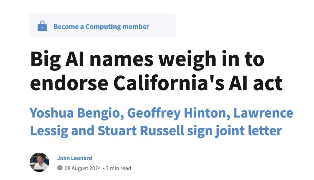 起因是8月7日,人工智能领域的大拿们写了封联名信,支持加州议会的一项AI监管法案。
