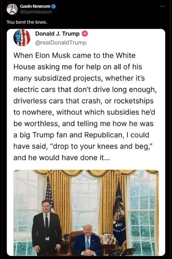 马斯克刚刚宣布X和Space X大迁徙,加州州长纽森就急了,特地翻出一条两年前川普羞辱马斯克的推文阴阳怪气,“烙铁,你(向川普)跪了啊。