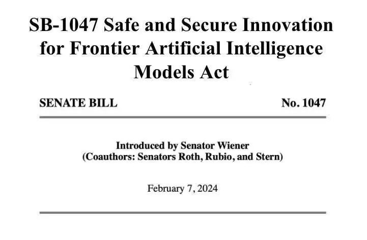 这个AI监管法案,全称《前沿人工智能模型安全创新法案》,代号SB 1047,目前已经通过了加州相关委员会,即将送到两院正式表决。