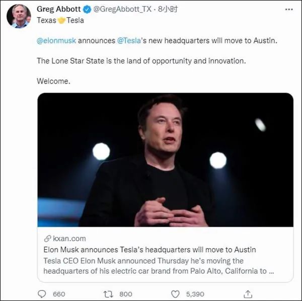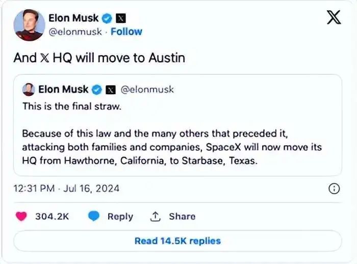 7月17日,马斯克再次发推宣布,要把 X 与Space X 的总部搬到得克萨斯。