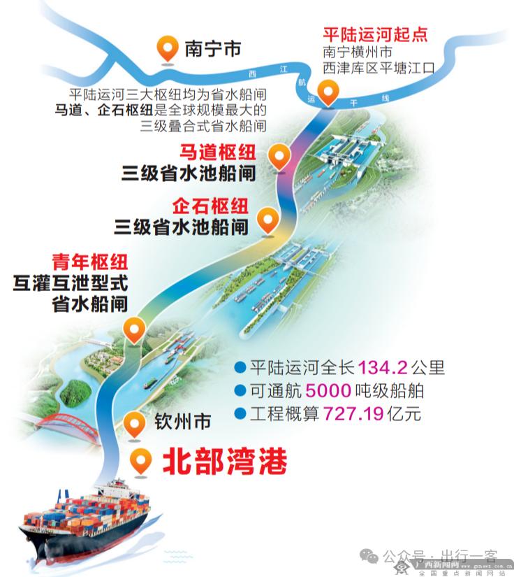 平陆运河建成之后,广西将盘活自身港口,实现大部分河流就近向南入海,把出海距离缩短整整560公里。同时,作为内河一级的最高等级航道,平陆运河预计克服65米的水位落差,实现5000吨级船舶连续航行。