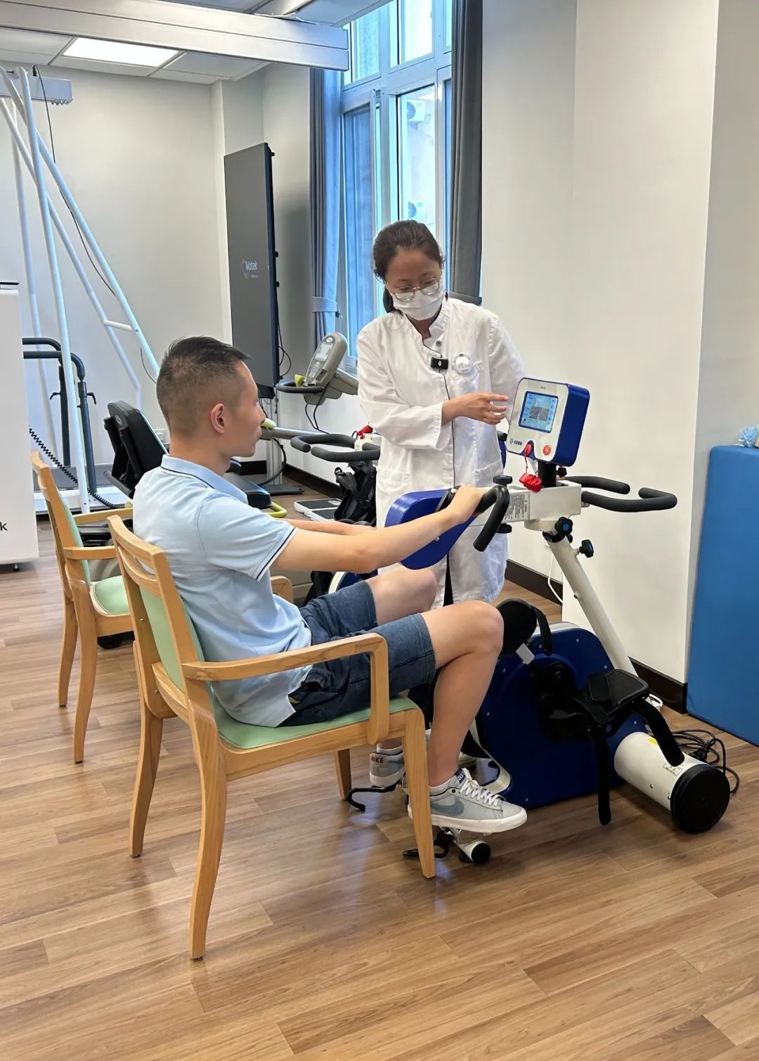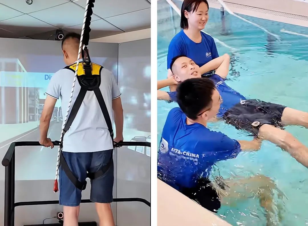 比如他们有一个设备看着很像体感赛车游戏,其实是可以锻炼老人平衡能力的三维平衡训练系统,还有类似跑步机的步态评估训练器械,用来预防老人跌倒。最有意思的是水中康复的训练,我跟着工作人员下水,在水中做动作,感受水的浮力,它可以让老人的身体在水中恢复知觉、舒展肌肉、放松心情。