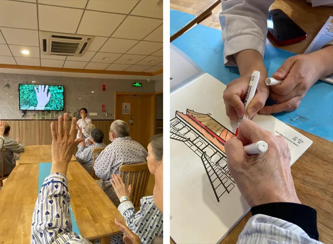 后来给他们找到的一家养老院,有很多认知症老人,它的电梯是需要刷卡才能进的,老人自己打不开,而且全部电梯门都会做成暗门,比如做成书架、花墙的样子,所以像这位奶奶一样容易走丢的情况,就可以很好地避免。平时护工也会带老人做蒙台梭利引导式的锻炼活动,类似于搭积木、给袜子配对、音乐疗法、宠物疗法等。