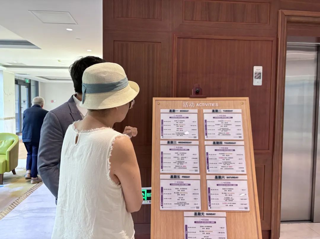 ▲夕阳在一家养老院参观,展示板上写着老人每天的活动
