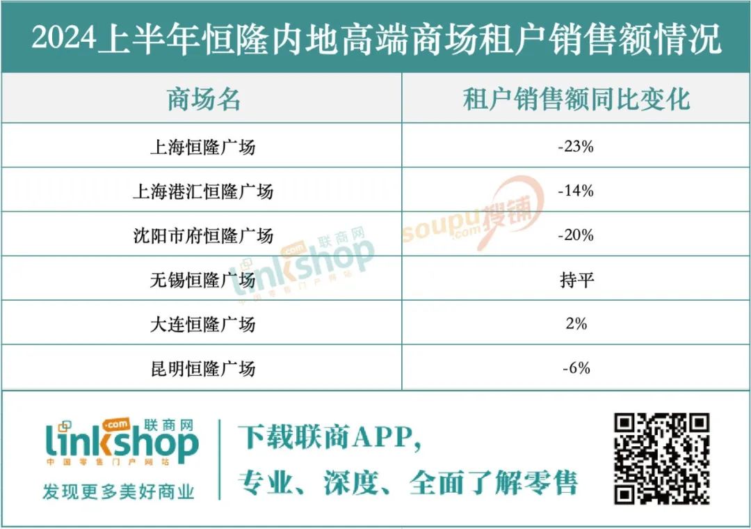其中,内地整体租赁收入下滑4%、租户销售额下滑13%。内地零售物业方面,2024上半年恒隆的商场组合收入下跌3%。