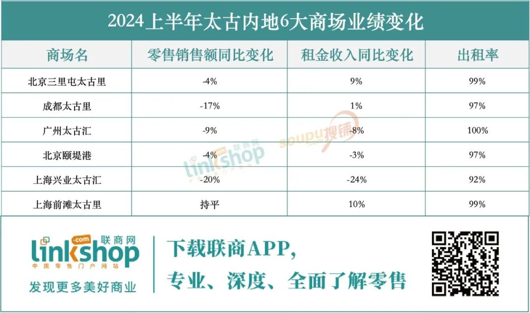 内地零售物业上,太古上半年内地商场整体零售销售额同比上升了4%,但具体到项目上看,依然呈现了高端商场主跌,综合类商场相对稳定的格局。