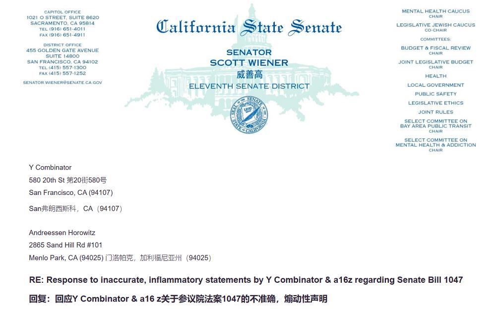 在YC和a16z发起宣传攻势后,加州AI安全法案主笔、加州州参议员威善高发长信正面回应了相关控诉,称这2家机构关于加州AI安全法案的许多表述都是不准确的,有些说法“极具煽动性地歪曲了事实”,如法案将把未能准确估计模型风险的开发人员送进监狱,或是禁止开源发布。