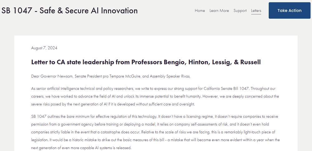 ▲4位知名学者写信支持加州AI安全法案(图源:safesecureai)