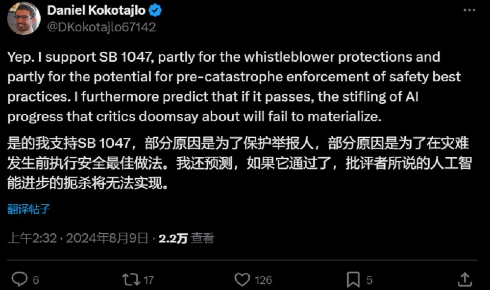 多名OpenAI前员工也支持这一法案,包括主动放弃OpenAI期权从而换取自由批评OpenAI公司权利的丹尼尔·科科塔约洛(Daniel Kokotajlo)。他认为,法案批评者称AI进步会停滞的说法大概率不会发生。